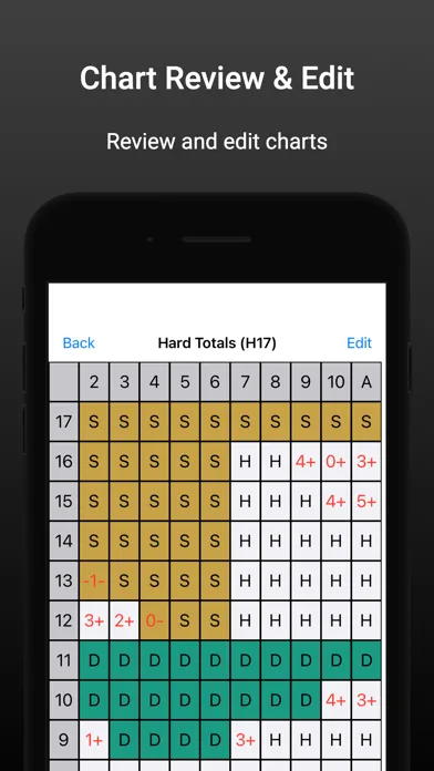 + Charts Review and Edit. View charts for basic strategy and deviations. All chart values are customizable.