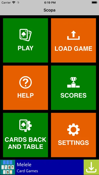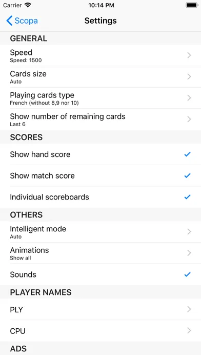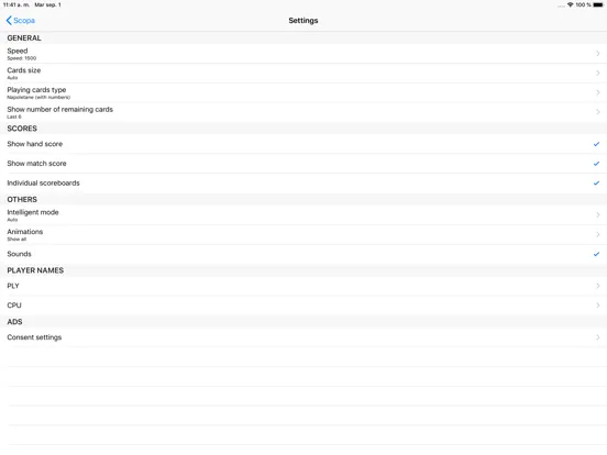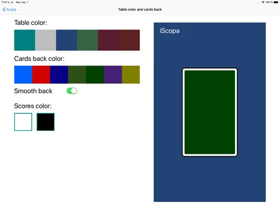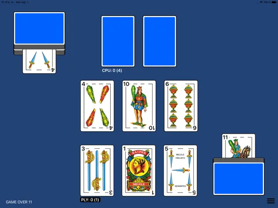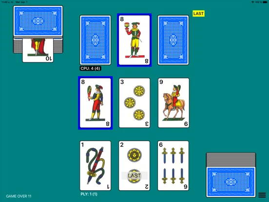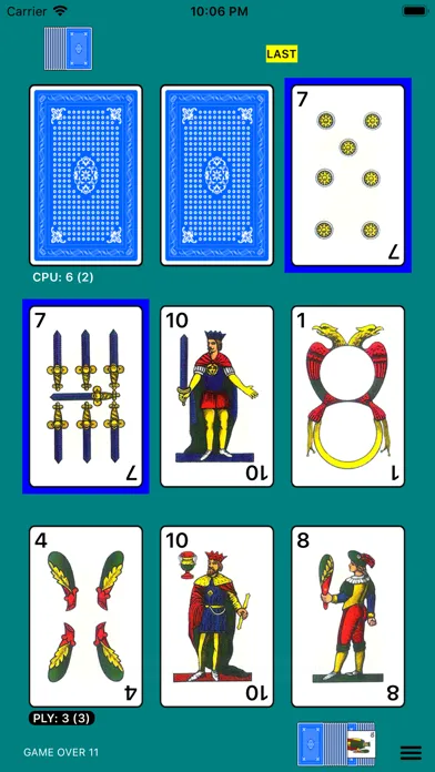 - Settings: Playing cards type (napoletane, spanish or french), cards size, cards back color, sound, scoreboards, table and scores color, cards numbers size, animations,...