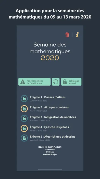 Les énigmes sont disponibles à partir du 9 mars 2020. Chaque jour, dès minuit, l'énigme quotidienne est déverrouillée et peut alors être résolue. Chaque énigme comporte trois niveaux de difficulté croissante. En général, le niveau 1 est facile et permet de saisir les manipulations à effectuer. Le niveau 3 est difficile pour des élèves de primaire, qui pourront le plus souvent résoudre le niveau 2.