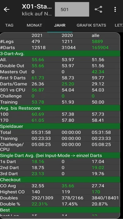 Keep track with your progress in miscellaneous variants and bring your gameplay to the next level by detecting your problems and optimizing your play. My Dart Training supports you in doing so.