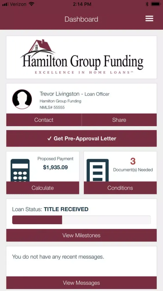 The Hamilton Group Funding app allows all 3 parties (home buyer, loan officer, real estate agent) to track the progress of the home loan application process as the Home Buyer meets the milestones and conditions required to get final approval.