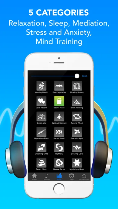 - 5 categories: Relaxation, Sleep, Meditation, Stress and Anxiety, Mind Training