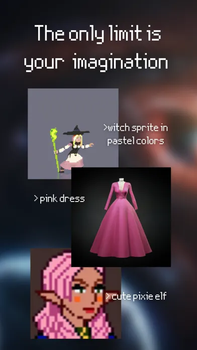 1. Describe what you'd like to create– let your imagination run wild! Add special traits to your characters like "King with a gold robe", "blue eyes dragon" and "big teeth rabbit". PixelVibe is your character creator and deep dream generator.