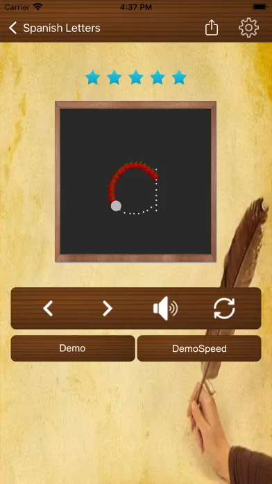 The demo feature displays how each Spanish letter can be practiced with adjustable demo speed.