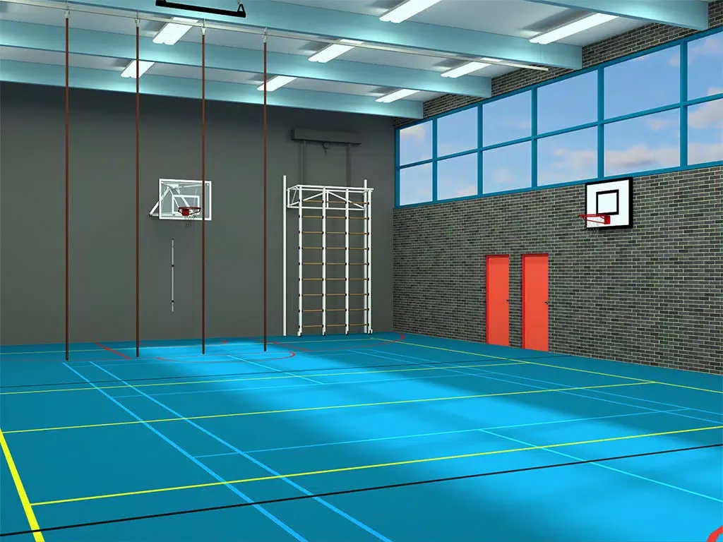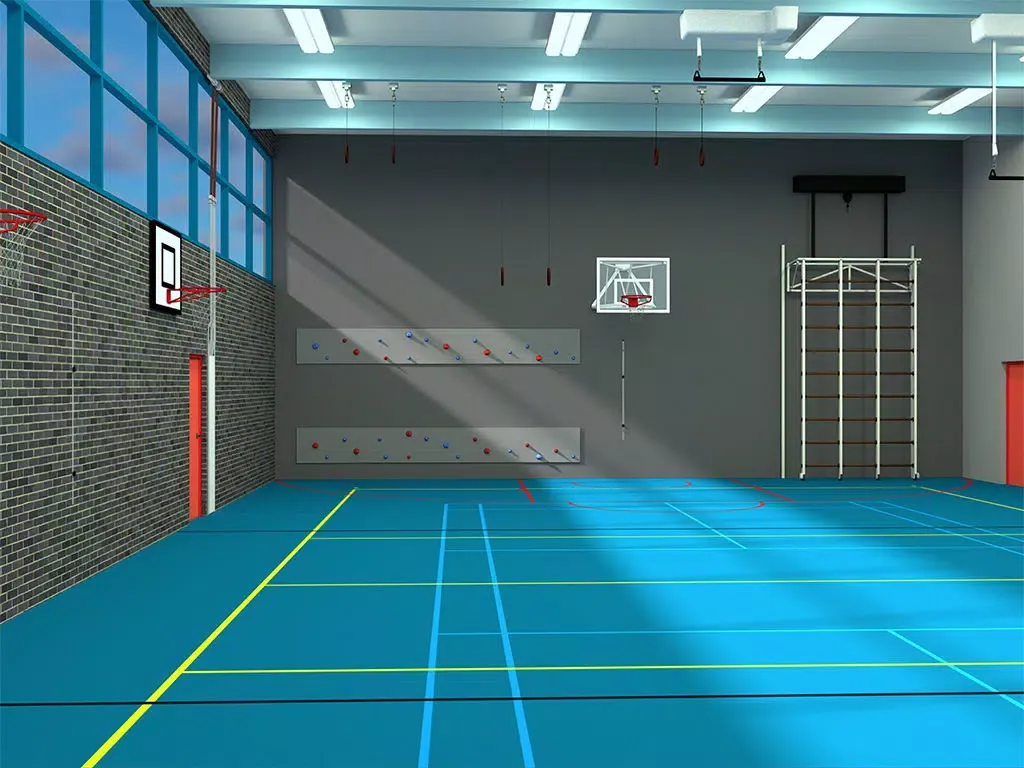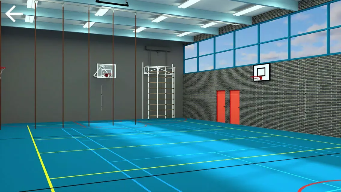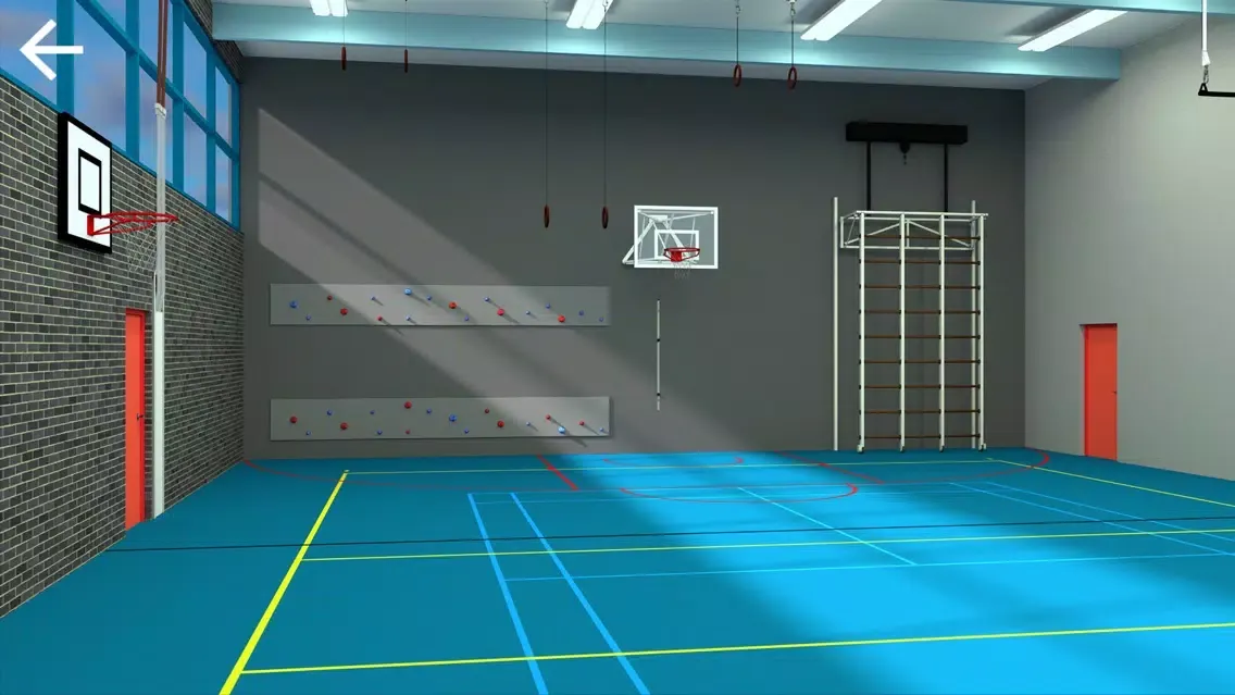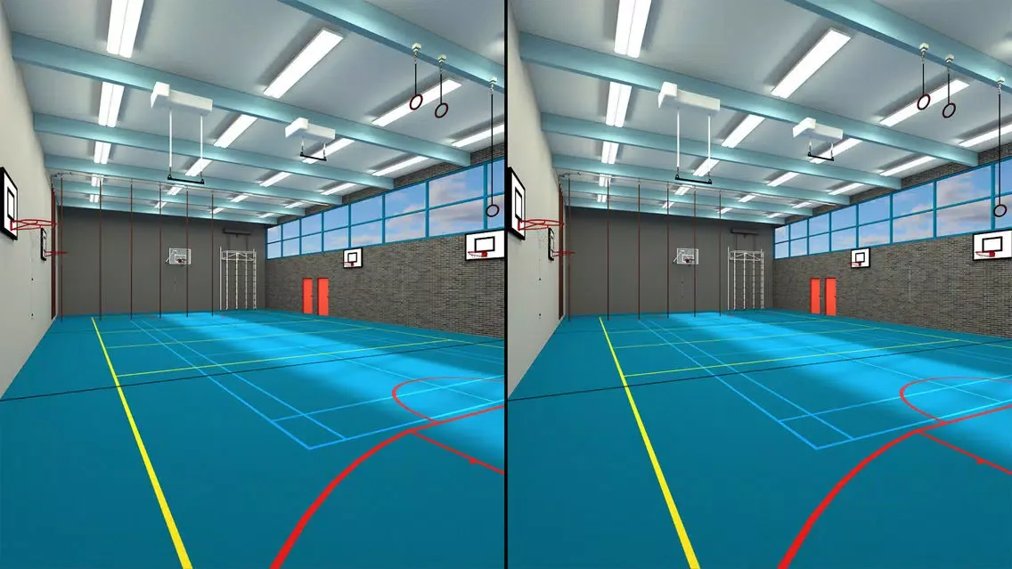 Loop door een virtuele sporthal. Geschikt voor zowel voor de tablet als de telefoon. Geen Cardboard? Geen Probleem! Bij het starten van de applicatie op een telefoon is te kiezen tussen 1 of 2 ogen-modus.