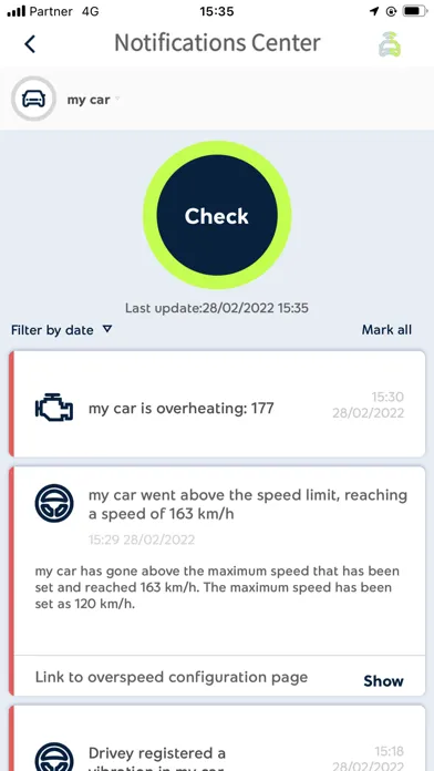 You can personalize your experience by selecting which notifications you want to receive. You can add multiple cars within your Drivey account, and you can choose to share statistics of one of your cars with other users with no extra costs.