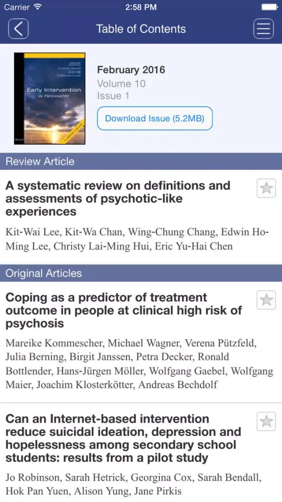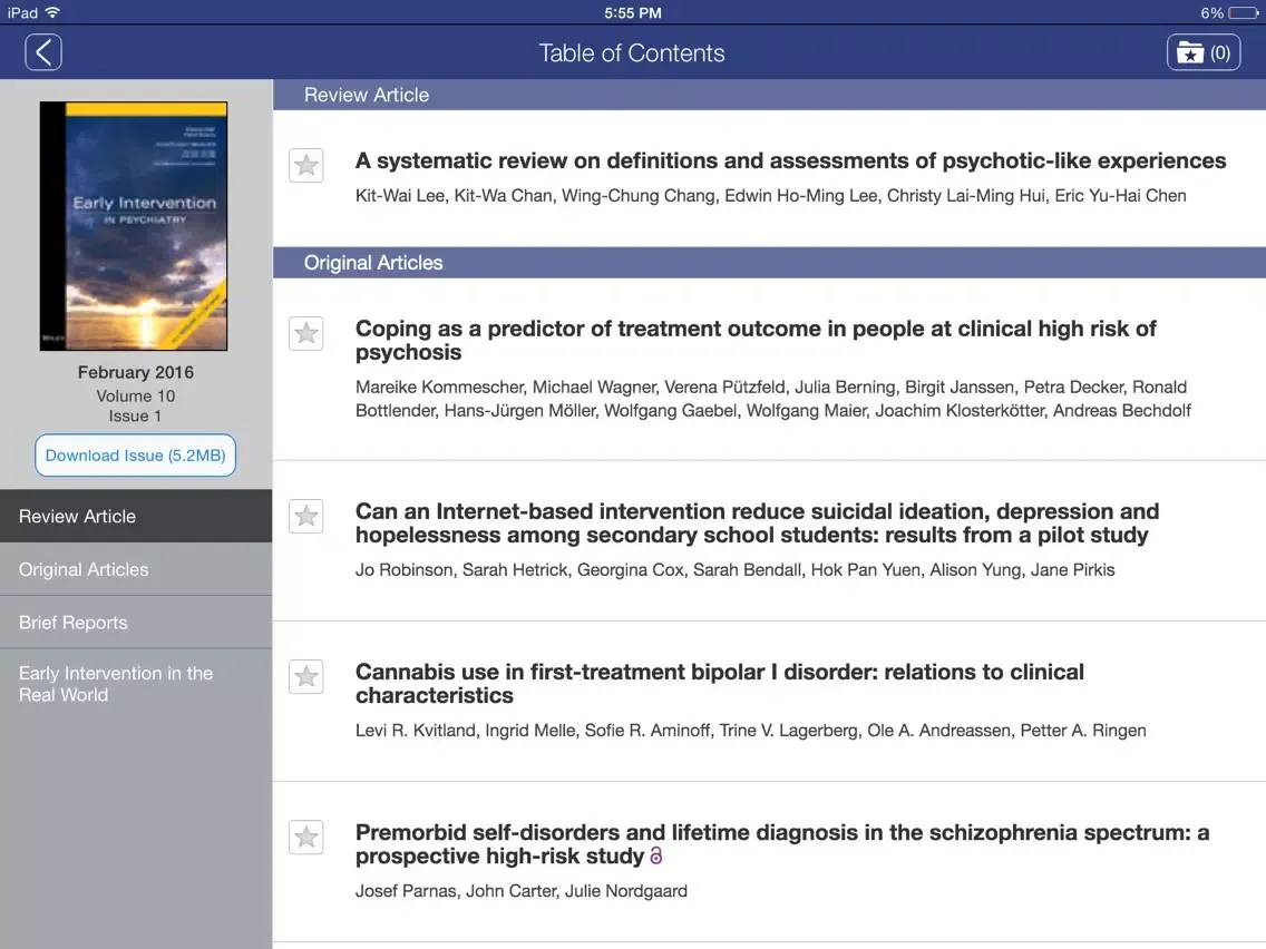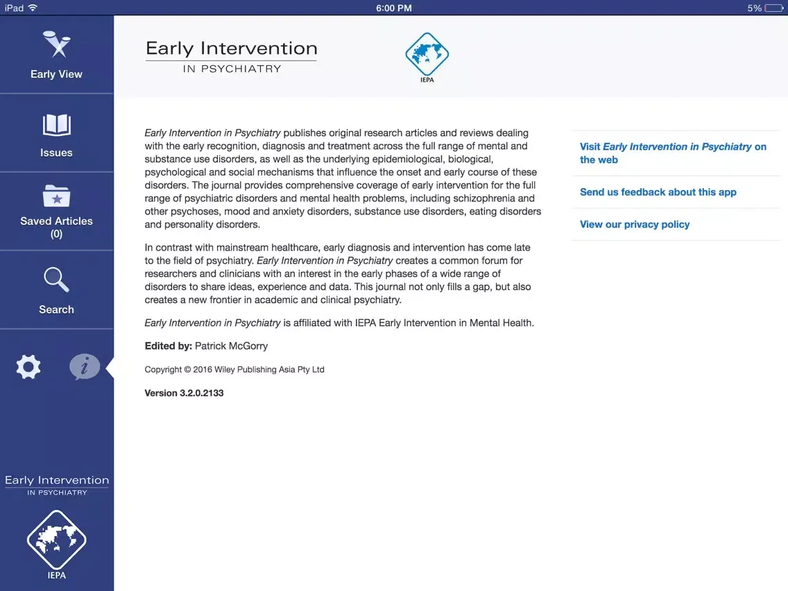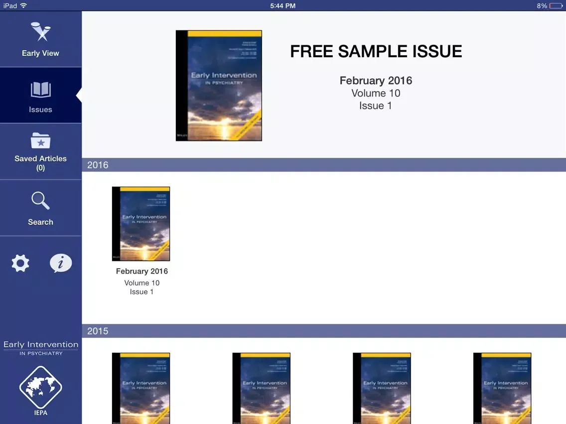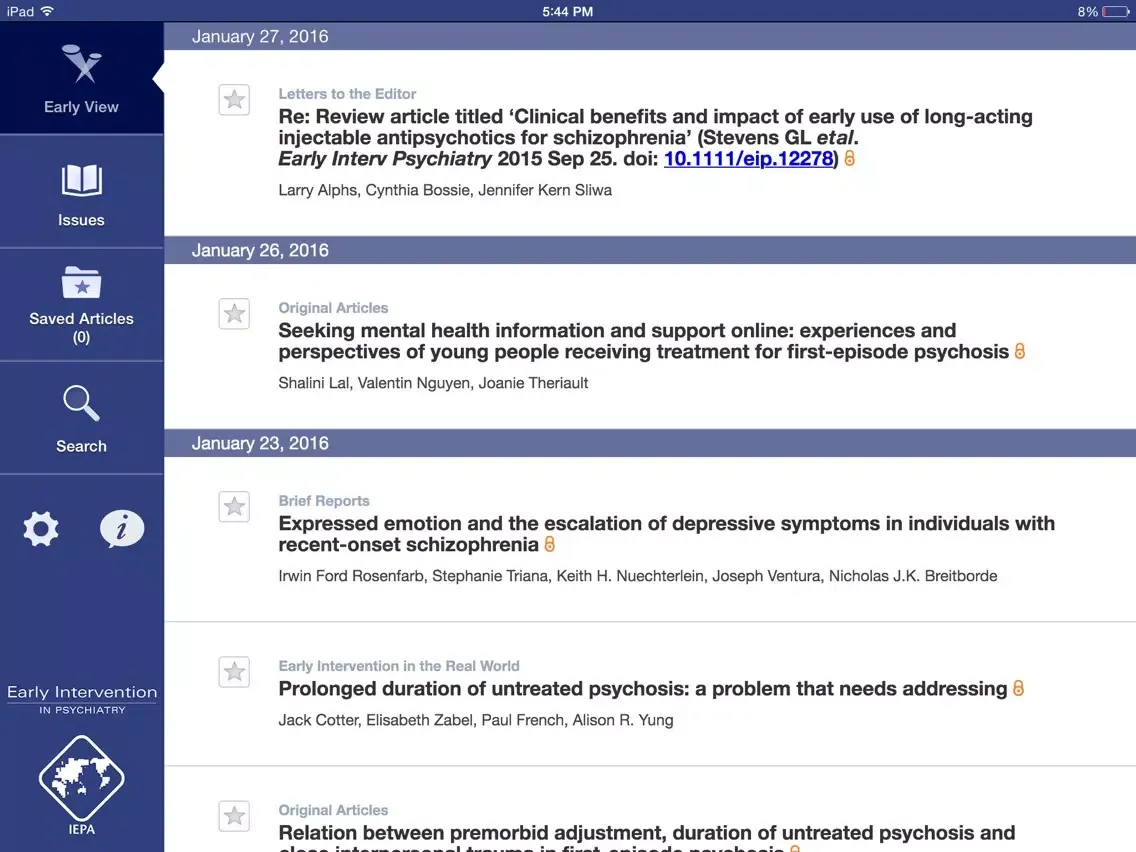 CURRENT SUBSCRIBERS to Early Intervention in Psychiatry can “pair” their device with their personal or institutional subscription to enjoy full access in this iPad edition.