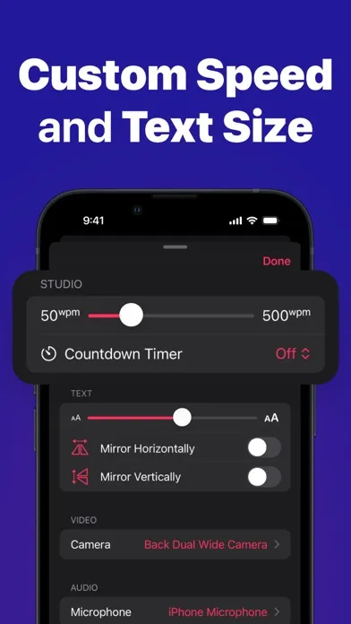 • Mirroring Options: Whether you're using a physical teleprompter setup or just your phone, you can mirror the text horizontally or vertically.