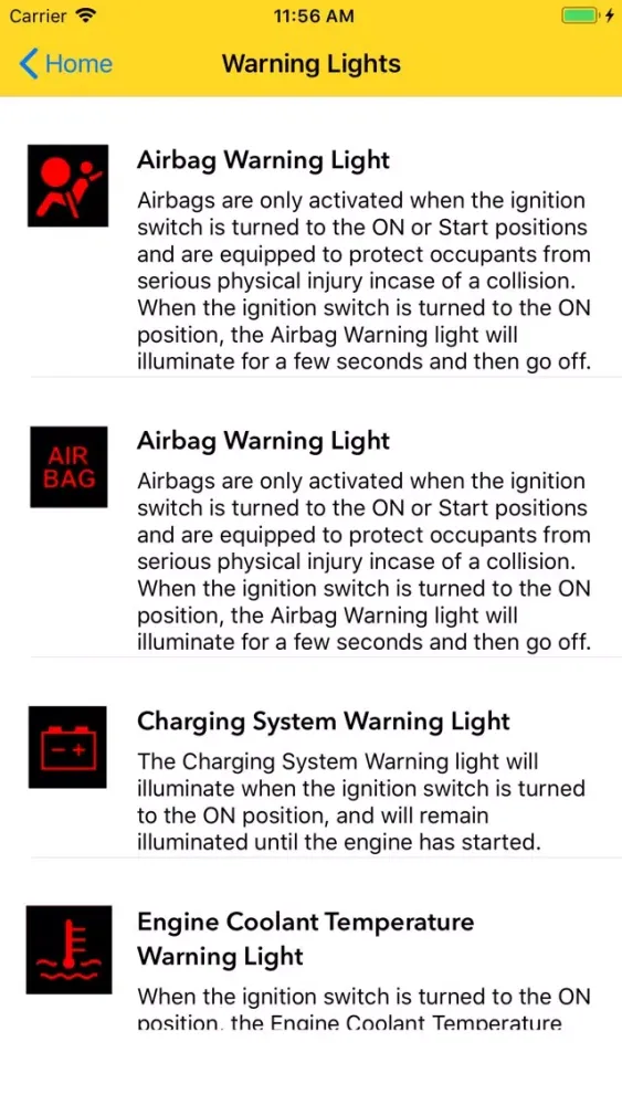 If your car have a warning light comes on your car Dashboard and you don't know warning light mean so this app will help you to know what is the problems.