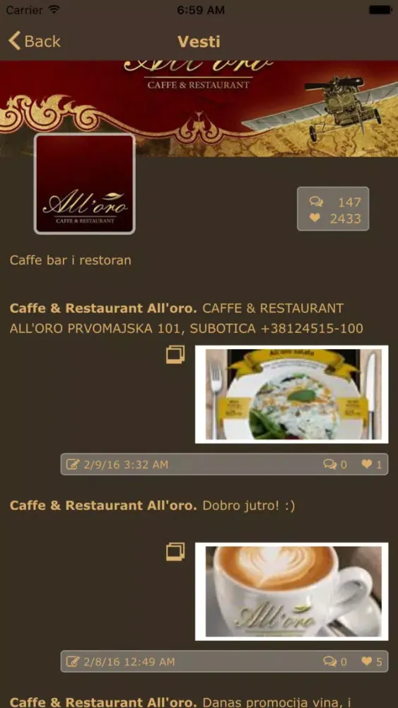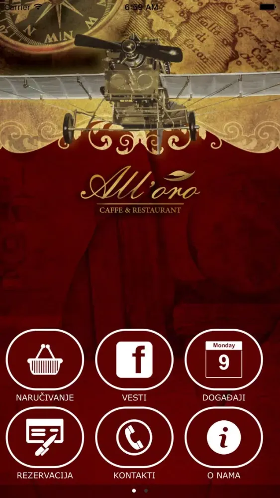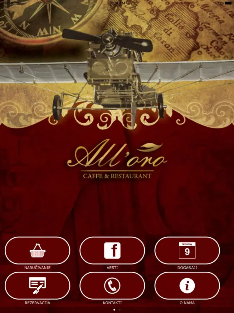 Preuzmite besplatnu aplikaciju All'oro caffea, instalirajte je na svom mobilnom uređaju i povežite se s nama u trenu, kad god to poželite. Takođe pogledajte kompletan meni s bogatim izborom jela i usluga koje nudimo, rezervišite svoje mesto kod nas za neku posebnu priliku ili naručite kućnu dostavu vašeg omiljenog jela.