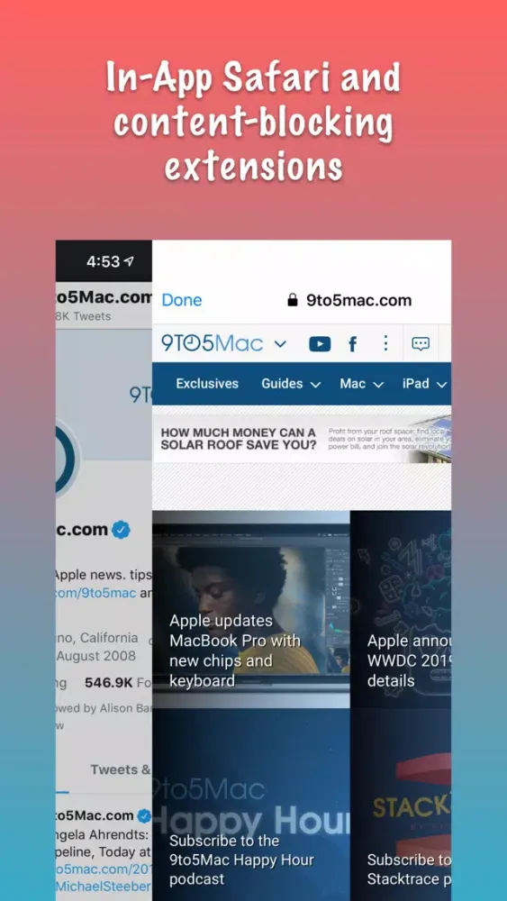 In-app Safari for external links supports ad-blocking and other content-blocking extensions.