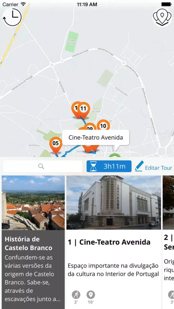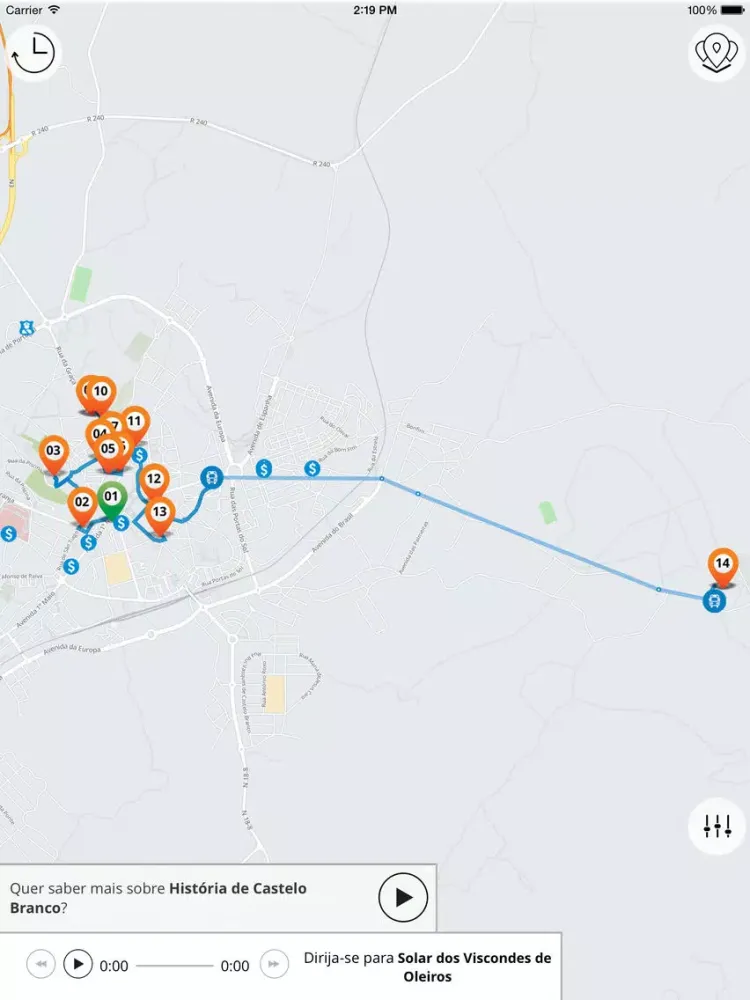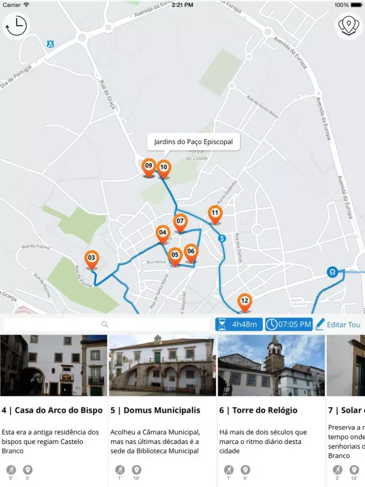 JiTT não conta apenas histórias, mas leva em consideração o seu tempo disponível. Se está numa viagem de negócios com pouco tempo livre para visitar os pontos turísticos históricos, ou se está simplesmente a dar um breve passeio pela cidade e quer aproveitar ao máximo sua viagem, JiTT irá criar um percurso que combine com o seu tempo disponível e os seus interesses. Se, por acaso, já visitou um dos pontos turísticos, pode simplesmente excluí-lo da rota; ou se quiser ver um monumento particular pode adicioná-lo. A aplicação irá recalcular o seu percursos e mostrar-lhe os pontos turísticos de Castelo Branco!