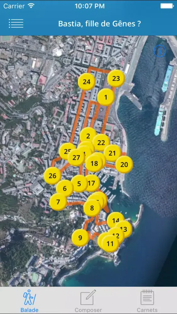 Le cheminement dans la ville, avec différentes étapes et changements de rythme, illustre un parcours toujours en mouvement. L’histoire racontée est une interprétation voulue, un éclairage particulier. Chaque point du parcours est un chapitre de l’histoire. Il se déclenche avec une musique suivie d’une voix, accompagnées par des photos et par des textes issus d’ouvrages sur la ville ou de romans écrits par des bastiais(es).