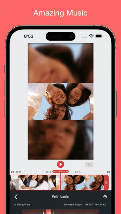 The app is very fun and easy to make slideshow videos. Starting by selecting photos and/or videos you want, then the application will automatically create a slideshow for you. After that, you can export or edit the slideshow using below tools: