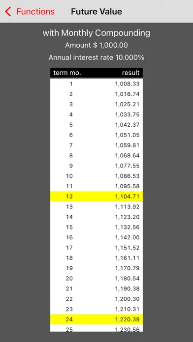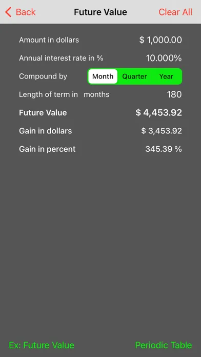 Once a computation has been performed for a particular term, you can access a "periodic table" that displays the calculated results for all periods up to the term so you can see how the results will vary over time.