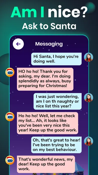 This app will give you chance to write and receive live messages from your favorite holiday hero. Whether you're looking to share your holiday wish list, ask Santa about his elves, or just have a friendly chat, our app makes it easy.