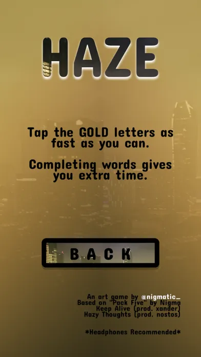 The theme behind this game is being in a "haze" or a deep thinking state, regarding current public and personal affairs. The game represents this, as you must tap the appropriate letters amongst the chaos, in order to form a word or coherent thought. It is ok not to have the answers, what's important is that you are finding them for yourself.