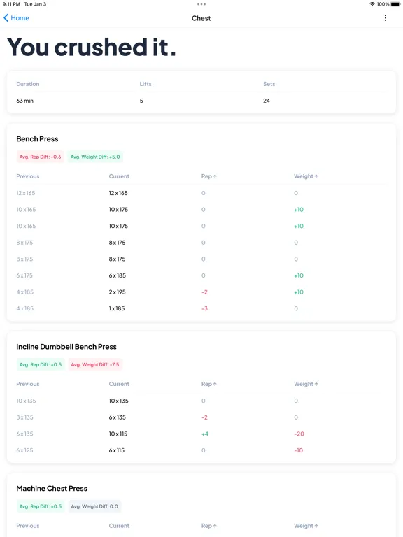 With our easy-to-use interface, you can quickly log your sets and reps during each gym session. Need some extra motivation? Our app displays your previous stats in real-time, so you can see exactly how far you've come and push yourself to new heights.