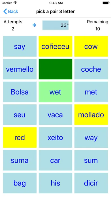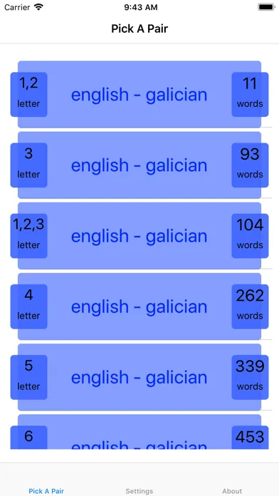 A tiny pick a pair app that helps you along, with learning the basics of Galician. Containing 1, 2, 3, and 4 (free), 5, 6, 7, 8 and 9 letter (paid for) English words translated to Galician for you to play at pick a pair. Test your self on the go!