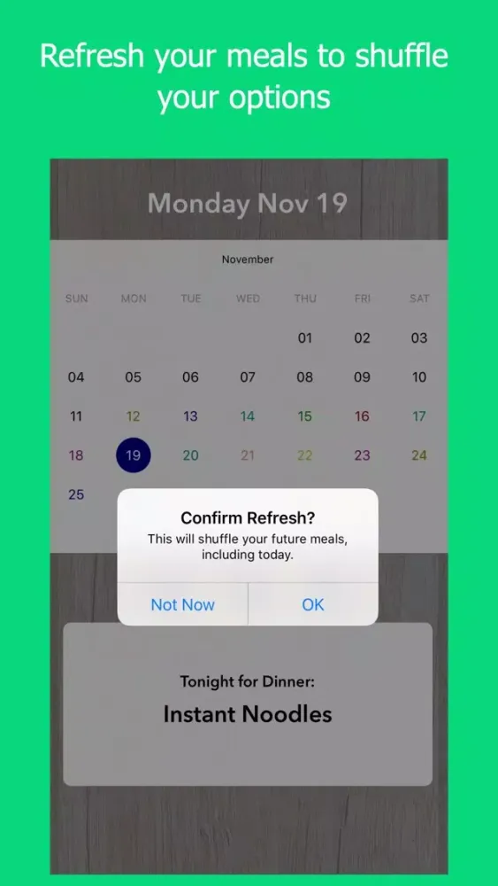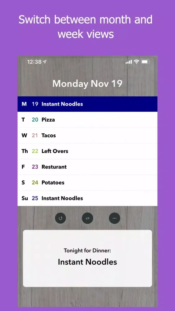 Easily switch between a weekly and monthly view, reshuffle your upcoming meals for more variety, and quickly add in and remove meals from your list.