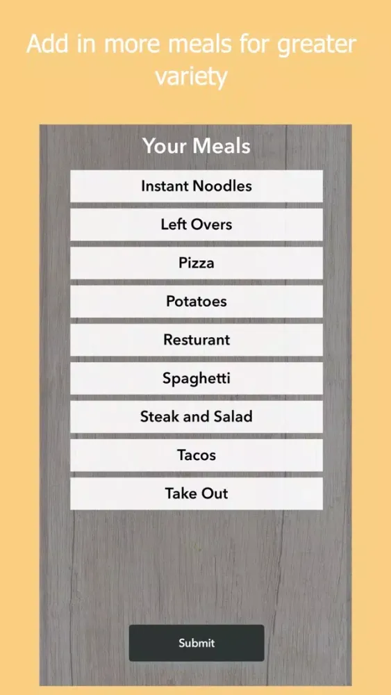 The application will make sure meals don't repeat for a certain period of time, based on the number of meals entered. We recommend that you have at least six entries and have a maximum of thirty entries.