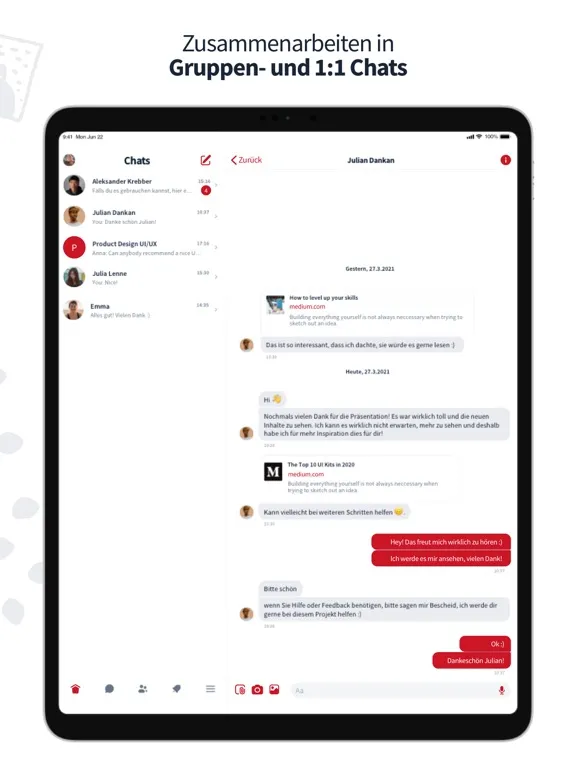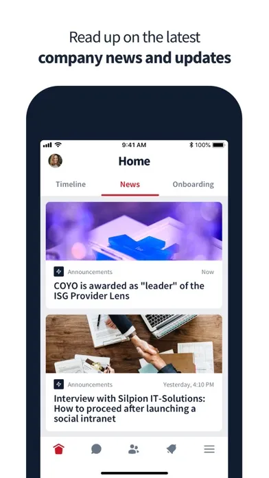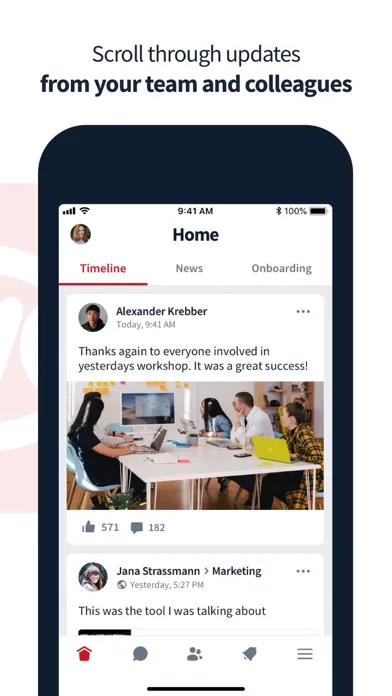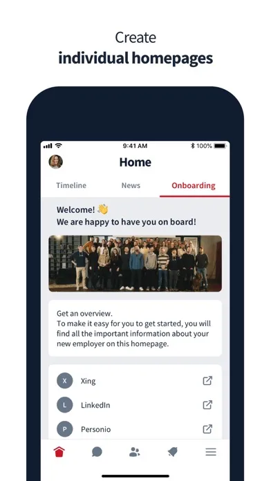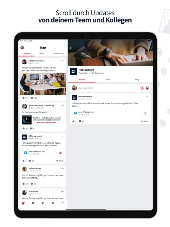 Du hast Zugriff auf deine persönliche Timeline mit all deinen News sowie Informationsseiten und deine Teamräume. So hast du wichtige Neuigkeiten immer auf einen Blick dabei. Du kannst Liken, Teilen und Kommentieren und dich so aktiv an der internen Kommunikation beteiligen. Außerdem kannst du Anträge stellen sowie an Events und Mitarbeiteraktionen teilnehmen.
