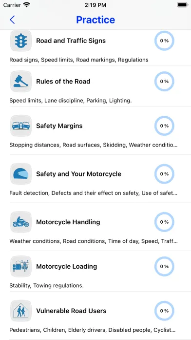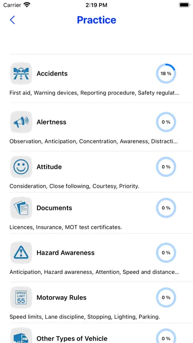 You can study the highway code by topic. All questions are sorted by topic. It also tells you the areas that each topic covers.