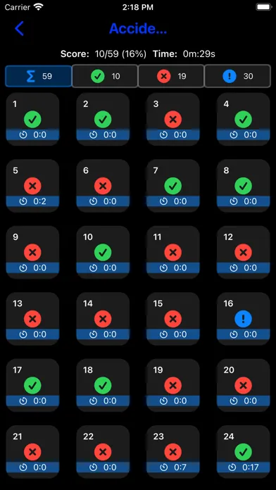 A summary of the practice test is presented at the end of each test. It shows you the time you took, the score, which questions you answered correctly and where you were wrong.