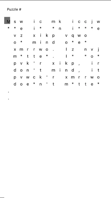 The Cryptogram puzzle board is not visible; instead, you play by listening. Flick left and right to move one letter at a time, and hear the encrypted letter. Swipe with 2 fingers to move one word left, or one word right. Swipe up to hear the entire encrypted puzzle, and your solution.