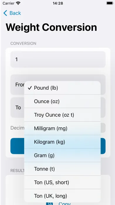 • Weight: lb, oz, milligram, gram, kilogram and tonne.
