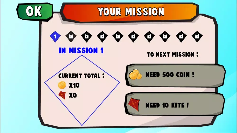 Collecting more coins and kites will make your score higher. Collect coins to improve your Character skills and collect many kites to unlock any new missions.