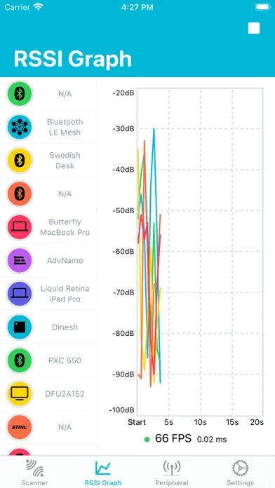 • Live RSSI Chart of Scanned Bluetooth LE Peripherals.