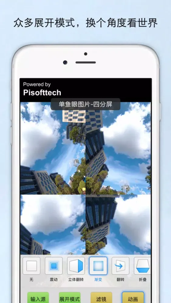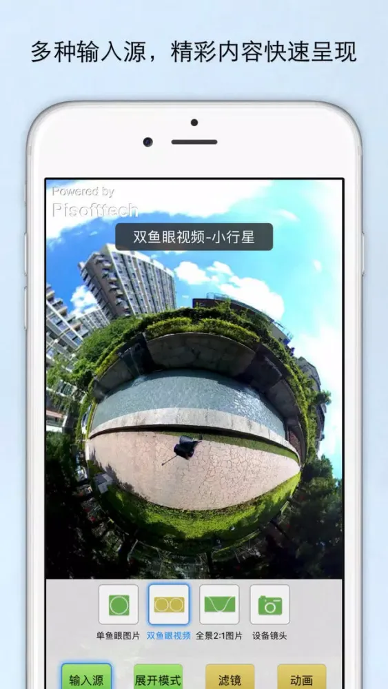 【强大】同时支持多个输入源和众多展开模式:沉浸、鱼眼、小行星、圆柱、VR、平铺、四分屏、双画卷等,超多体验任意选择;
