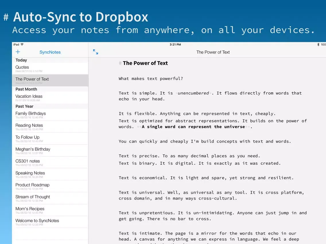 Keep your notes in sync from anywhere! SyncNotes is a modern text editor for the iPad and iPhone.