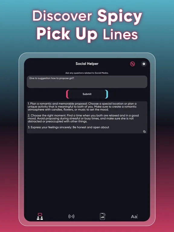 Consider every instance where words failed you. That tricky opening message on a dating app? The subtle nuances of maintaining a professional conversation? Or simply spicing up everyday interactions with friends and family? This app understands these dynamics, stepping in as your co-pilot, ensuring you never feel lost in the maze of digital communication again.