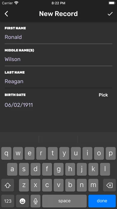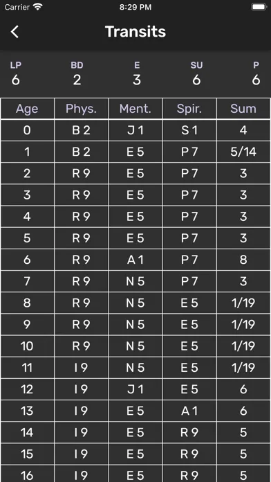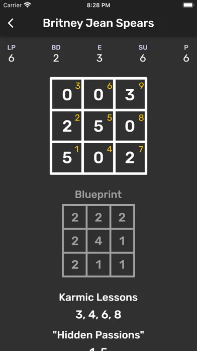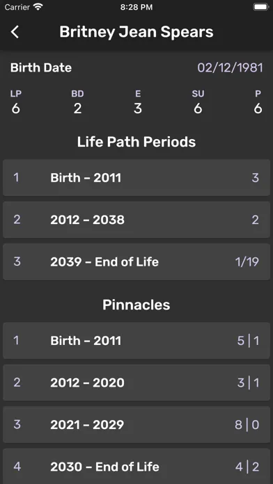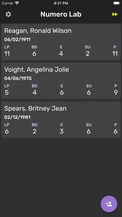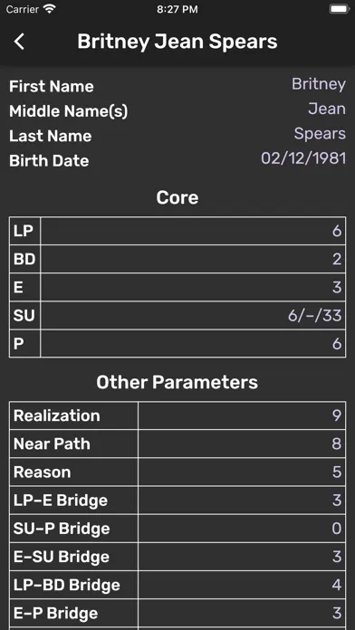 To determine the numerological parameters for the person you are interested in, create an entry for him or her (by clicking on the button in the lower right corner of the screen). Enter the person's first name, middle name, and last name (or at least the first name), as well as the date of birth. After the new entry appears on the main screen, touch it and you will see all the main numerological parameters for this person. The numerological core is discussed in detail in the introductory course, many other parameters will be explained in the coming more advanced courses.