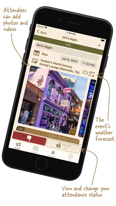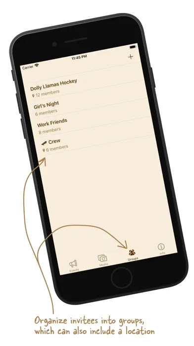 Create an event by simply answering who, what, when, and where, and receive notifications as invitees respond in or out. Organize friends into invitee groups for quicker event creation, communicate with invitees using event messages, share photos and videos from the event, even get the weather forecast of upcoming events. Perfect for girl's night, sports roll call, and any other "ad hoc" social event where you just need to know who's attending with as little hassle as possible. Want to send a formal invitation on frilly stationery with an RSVP? Well this app isn't for you! But it's perfect if you just want a quick and easy way to get together.