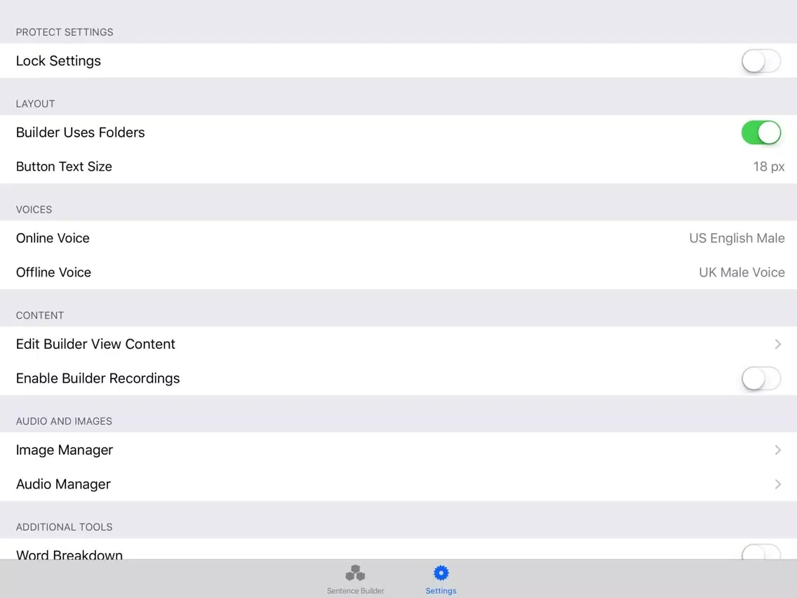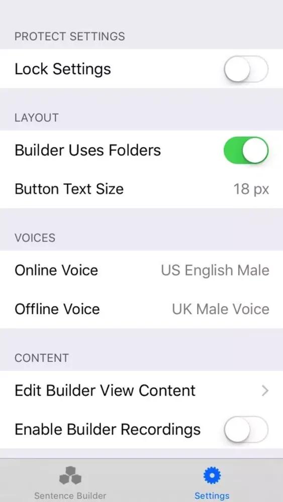 With Pocket Talk - Sentence Builder you can add, edit and delete the default categories and content at will, you can set custom images for the speech and category buttons from the default selection, your photo library or from the built in camera(if available).