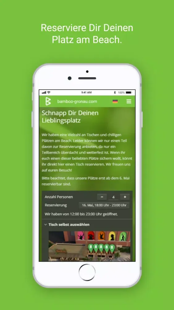 Mit der BamBoo!-App für Dein iPhone bestellst Du im angesagtesten Beach Club der Region Dein Essen und Getränke direkt zu Dir an den Platz. Suche Dir Deinen Lieblingsplatz im BamBoo! Gronau einfach in der App aus und reserviere ihn per Knopfdruck für Dich und Deine Freunde. Dank des eigenen Newstickers bleibst Du immer Up to Date und verpasst keine anstehenden Events mehr. Mit der BamBoo!-App bist Du in Gronaus ersten Beach Club genau richtig!