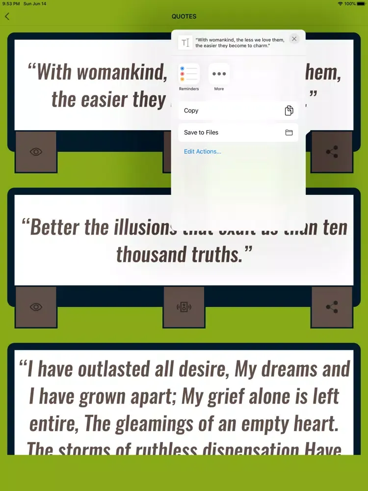 An easy to use application which doesn’t require a network connection for getting quotes and you can share your favourite inspiring quotes with the touch of a button and hear the quotes too.