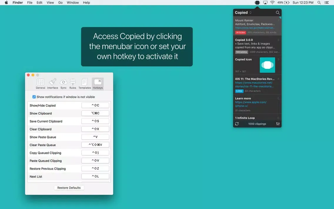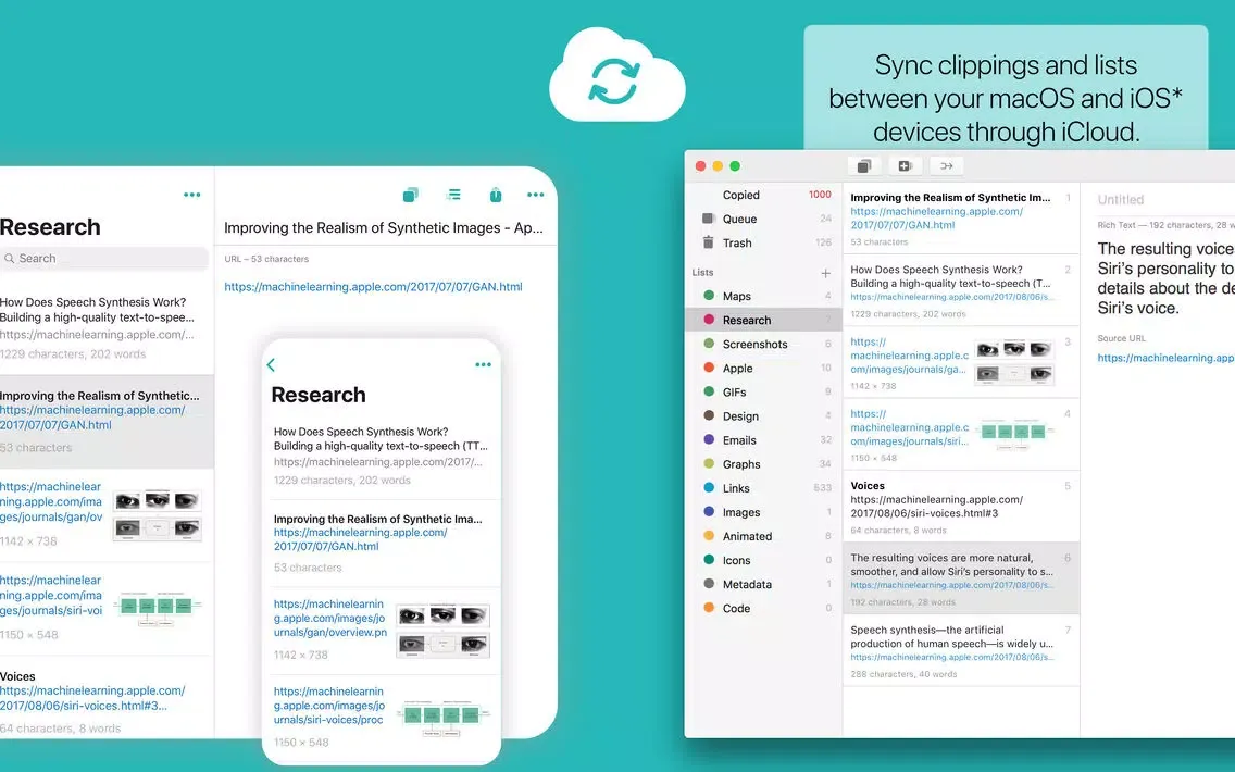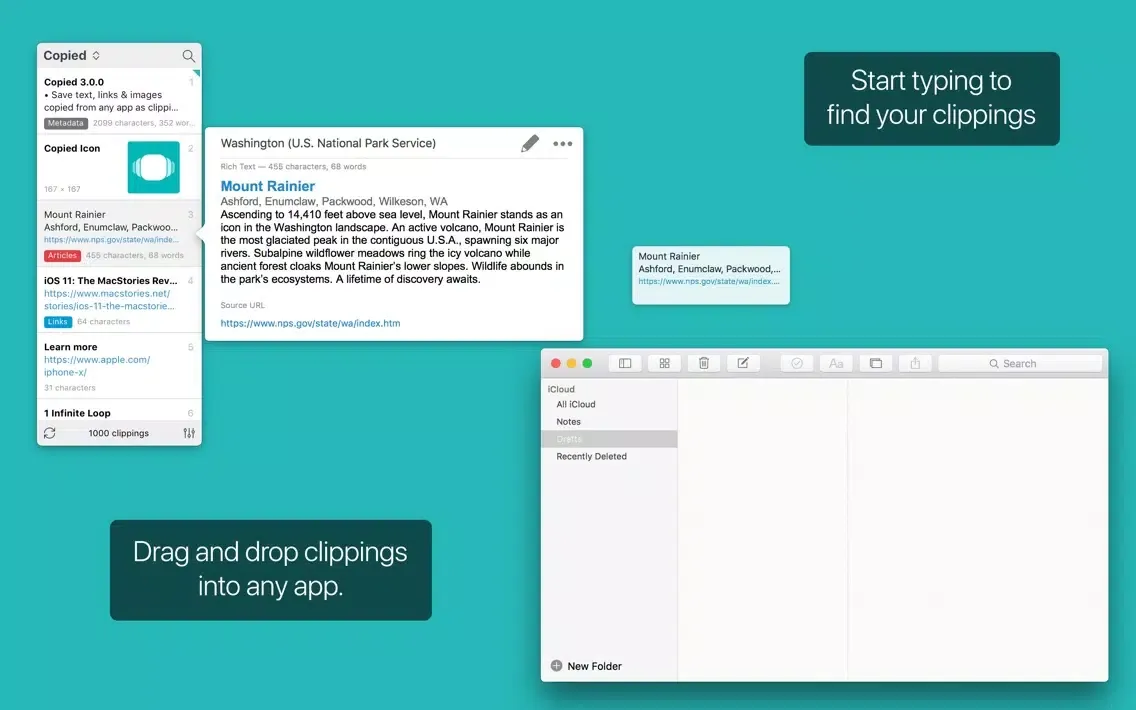 Use Copied to save snippets of text, images and links quickly. Edit your clippings and organize them in lists. Access your clippings easily and use them in any app.