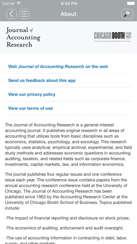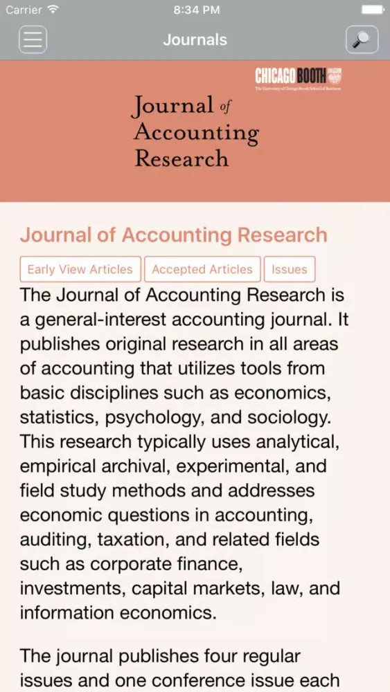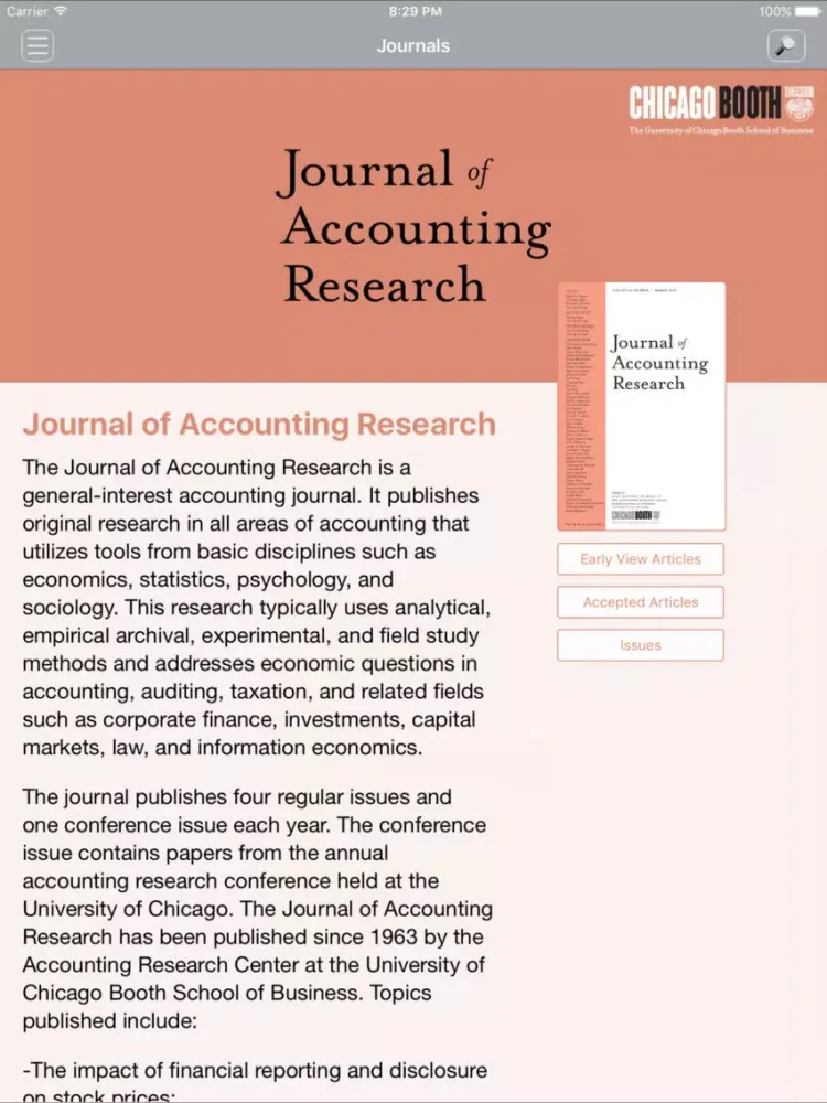 A leading accounting journal is now available on your iPad and iPhone. “Journal of Accounting Research” brings you a stimulating, high-impact mixture of Review Articles, Highlights, Communications, and more. Enjoy an entirely new browsing and reading experience, and keep up to date with the most important developments in accounting research even faster: