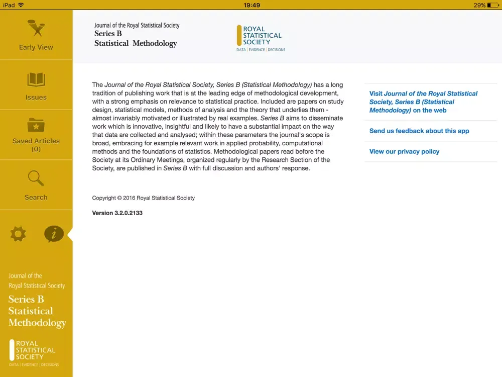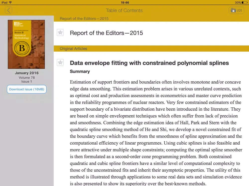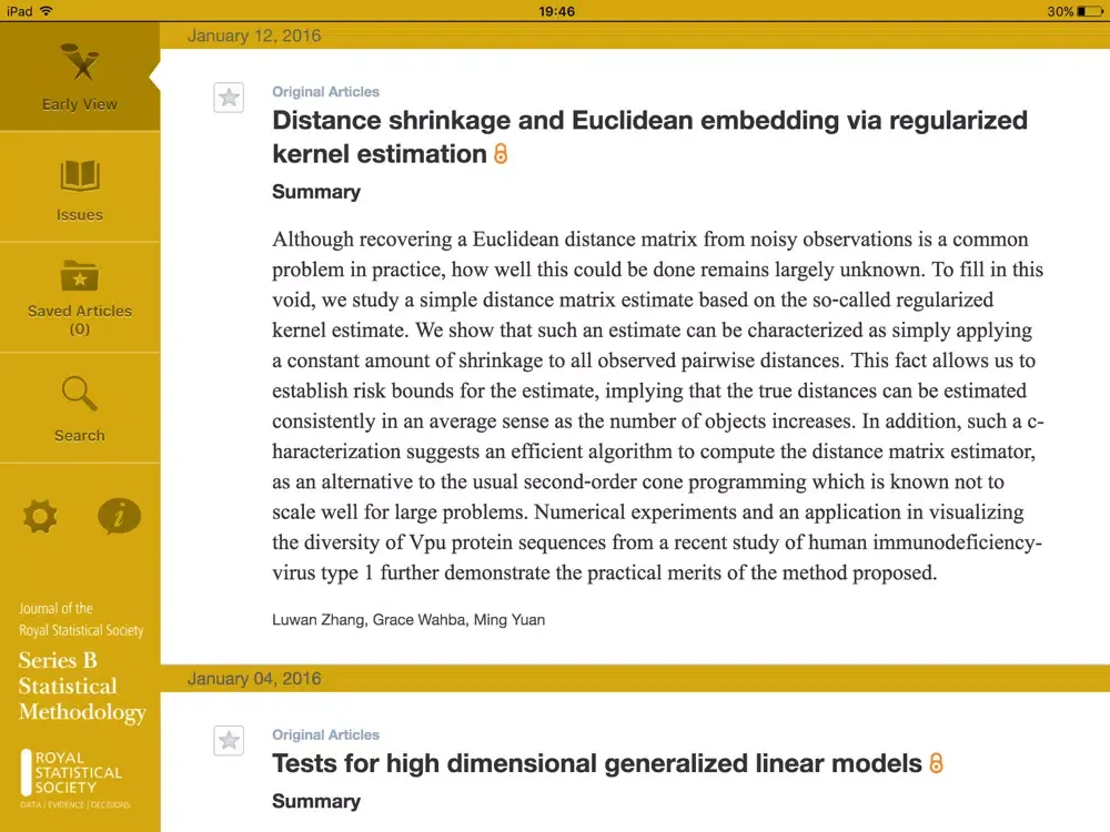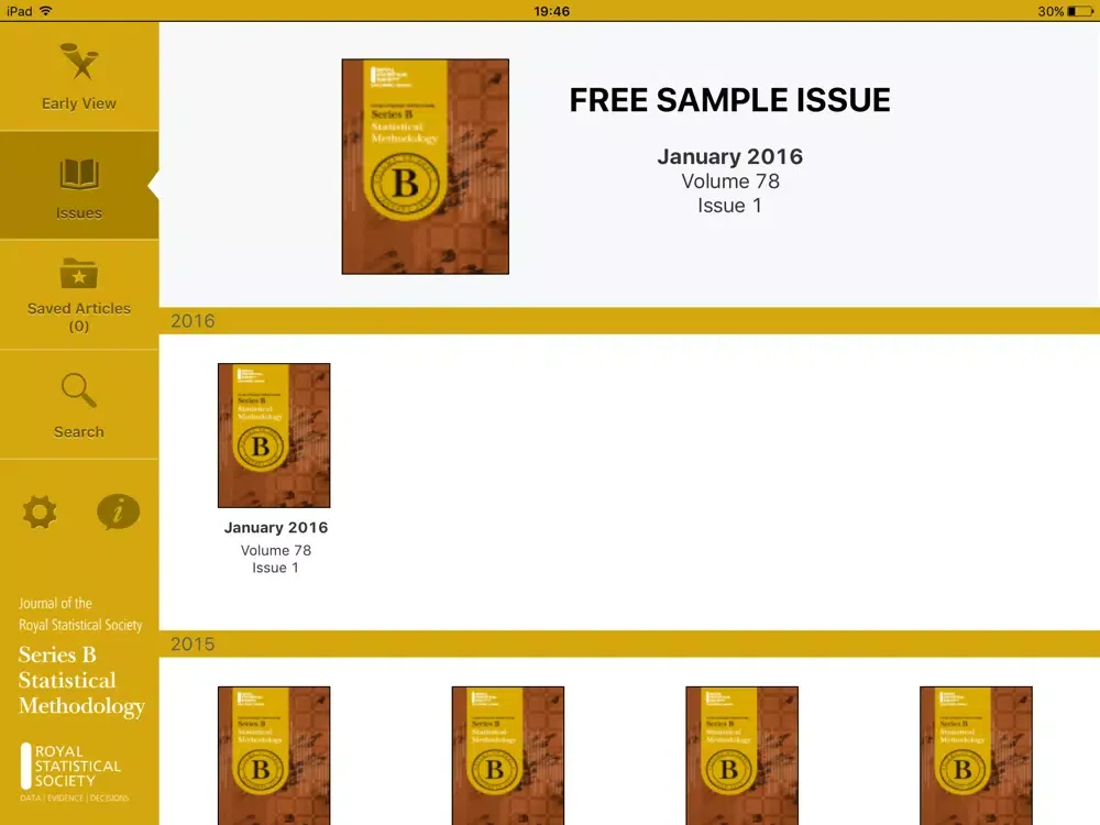 CURRENT SUBSCRIBERS to Journal of the Royal Statistical Society, Series B (Statistical Methodology) can “pair” their device with their personal or institutional subscription to enjoy full access in this iPad edition.