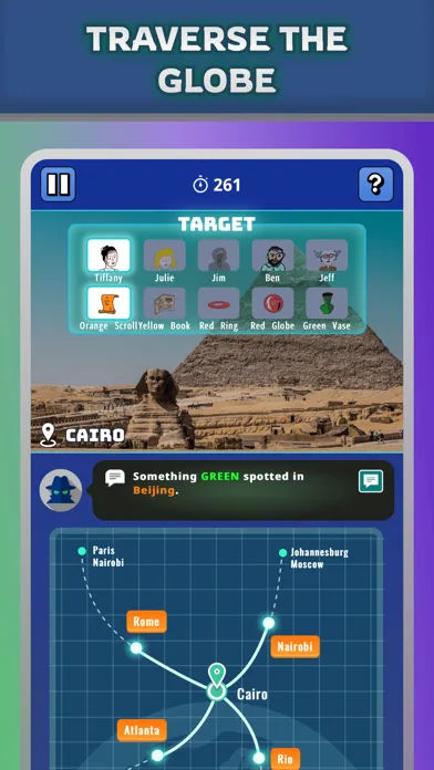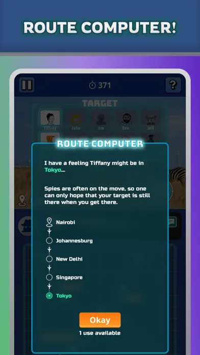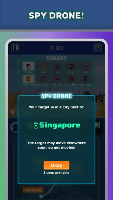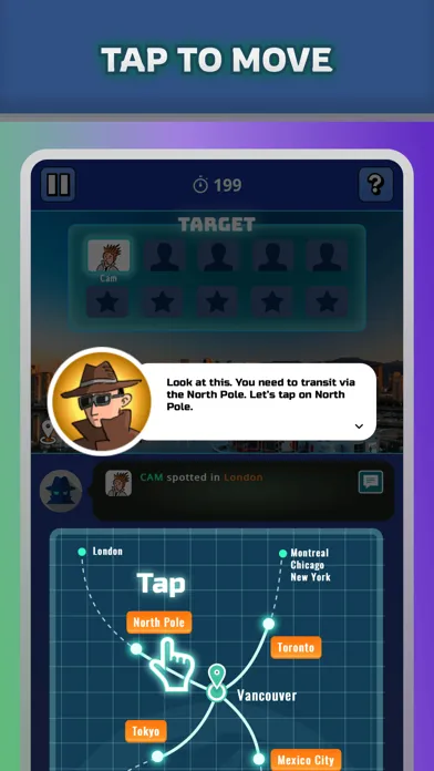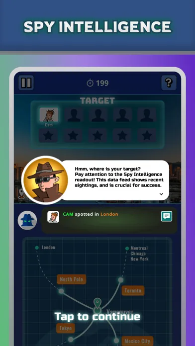 On the map: Tap the name of a city on the map to move there, and if you find your target spy or item there, tap on the target to capture it.