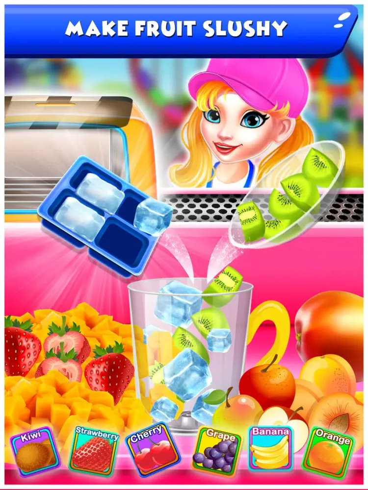 Hello everyone! We are Ice Slushy Maker - the most popular slushy brand in this city! We not only make various flavors of slushy, Our philosophy is yummy, fresh and fast! Look, this is the mini kitchen in our slushy Shop. We have the most popular slushy machines! And we’ll use fresh fruits with ice to make different flavors of slushy! Also, we can mix multiple flavors as you like!