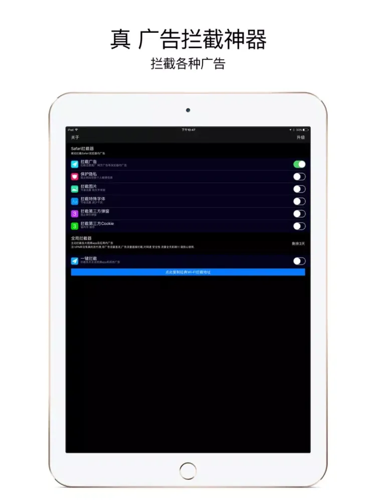 在主应用内下拉可以更新拦截规则,重启开关生效。