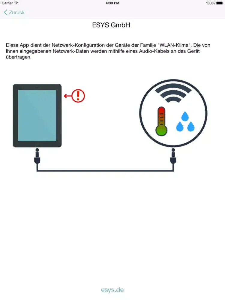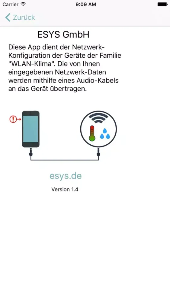 Diese App dient der Netzwerk-Konfiguration der Geräte-Familie "WLAN-Klima" der Firma ESYS GmbH. Die von Ihnen eingegebenen Netzwerk-Daten können mithilfe eines Audio-Kabels an das Gerät übertragen werden.