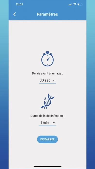 Une fois l’application lancée et votre profil complété, vous pourrez décider du délai avant activation des rayons UV-C et également de la durée d’exposition. Programmez ainsi la désinfection selon vos besoins et vos contraintes : par exemple si votre local est plutôt petit vous pouvez adapter le temps de désinfection et diminuer le temps d’exposition.