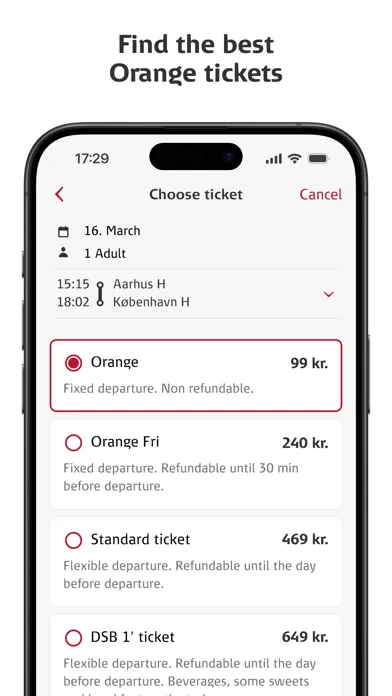 In the DSB app, you can purchase Orange tickets, a commuter card, or use Check in, and see current traffic information and an overview of departures. You can also buy a seat reservation for your trip.