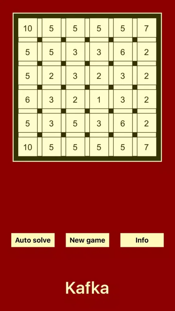 A 6x6 grid is shown. Every cell represents a room of a castle, with open doors on all sides. You have to draw the map of the castle, closing some of the doors.